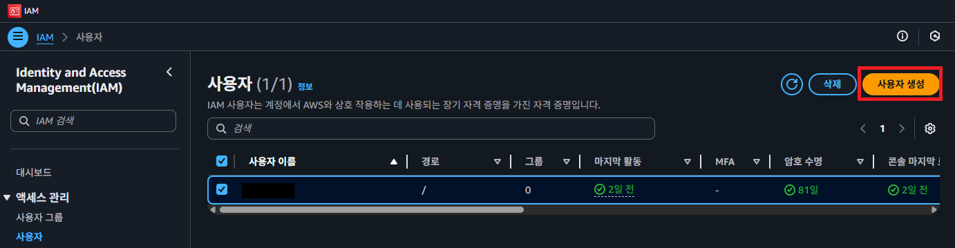[우측 상단에 IAM계정 로그인 확인 가능]